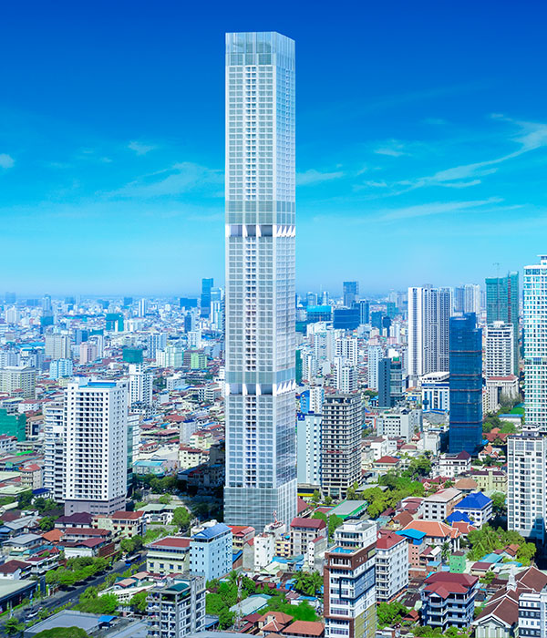 タワーレジデンスとしての上品なクオリティ都市のなかに、スリムなシルエットでそびえるタワーレジデンスカンボジアの青く透き通った空へと溶け込みながらも安定感のある印象を醸しだしています。